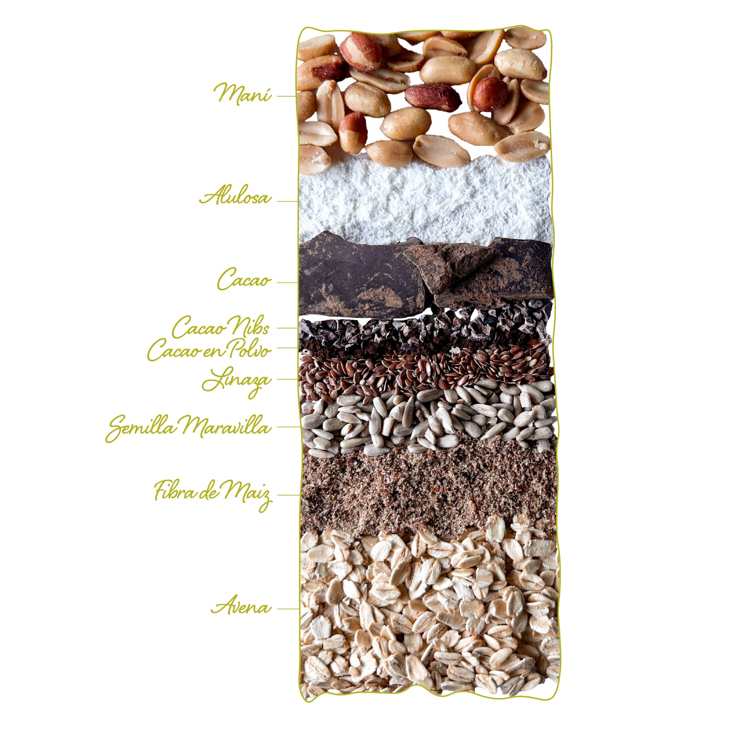 Ingredientes: Hojuelas de Avena, maní, alulosa, fibra de maíz, semillas de maravilla, linaza, cacao, nibs de cacao, cacao en polvo.