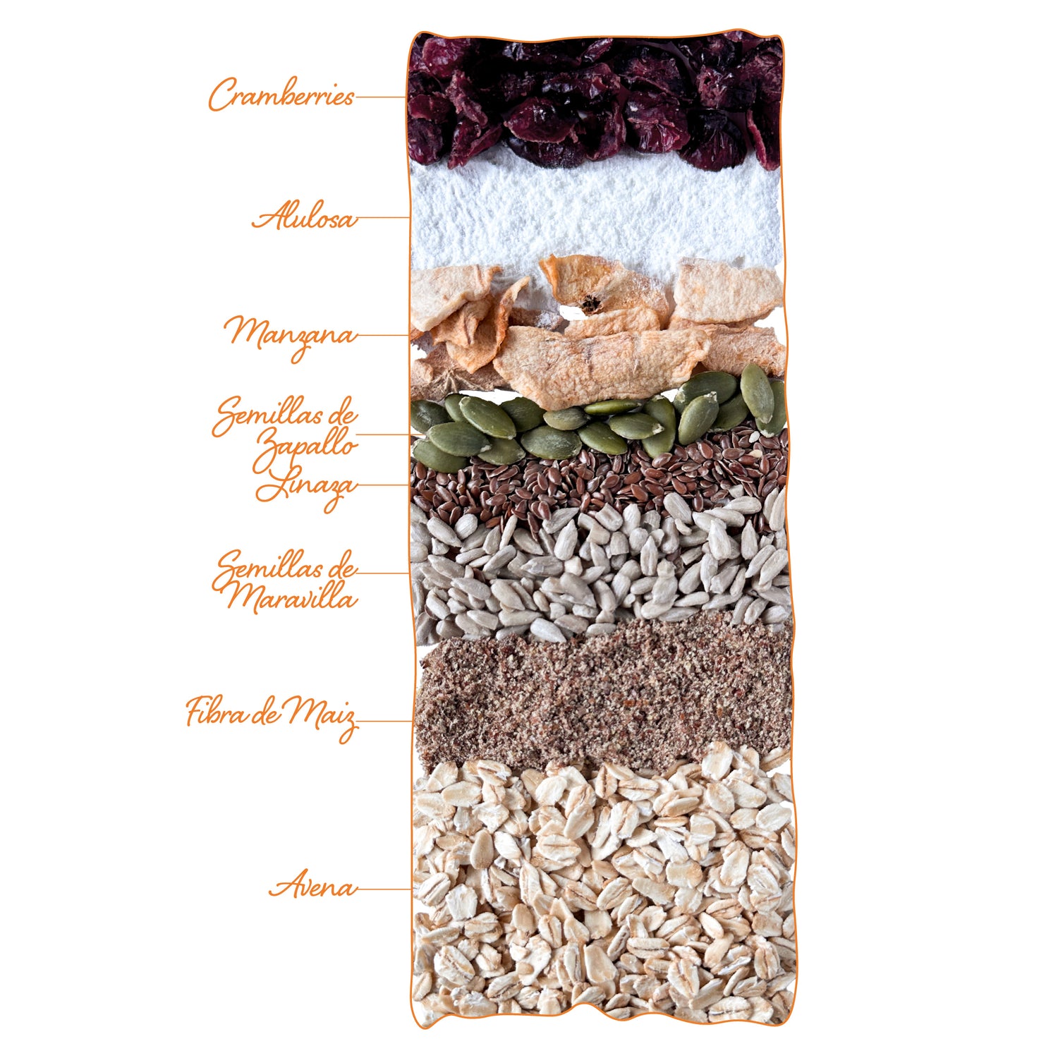 Ingredientes: Hojuelas de avena, fibra de maíz, alulosa, harina de manzana, semillas de maravilla, cranberries deshidratados, semillas de linaza, semillas de zapallo y concentrado de cranberries.