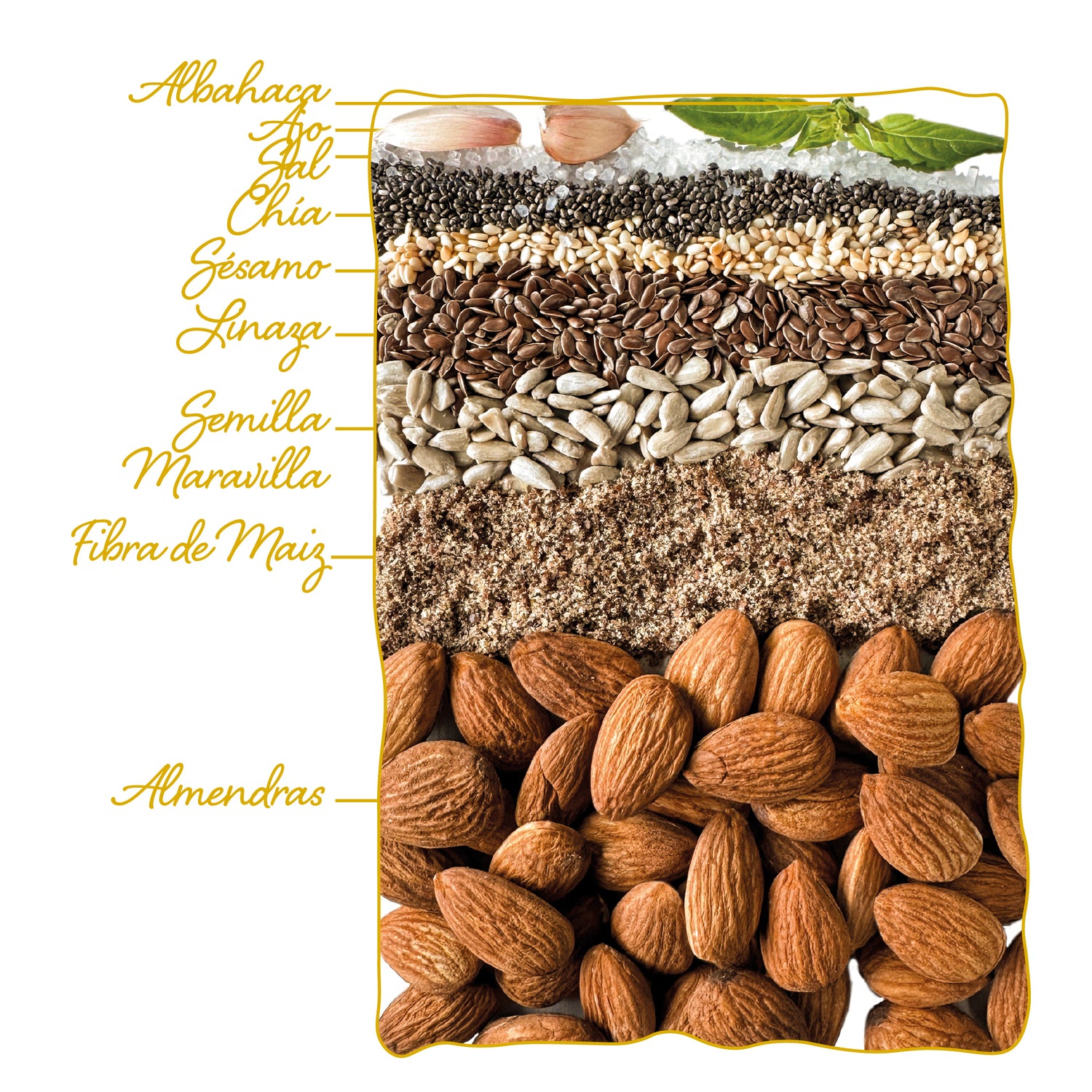Ingredientes: Harina de almendras, fibra de maíz, semillas de maravilla, linaza, sésamo, chía, sal de mar, ajo y albahaca.