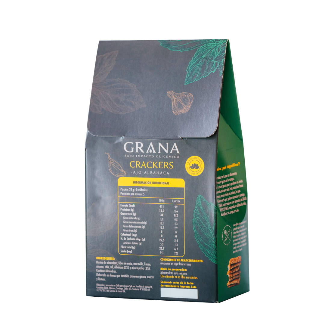 Ingredientes: Harina de almendras, fibra de maíz, semillas de maravilla, semillas de linaza, sésamo, chía, sal de mar, albahaca, ajo y bicarbonato de sodio.