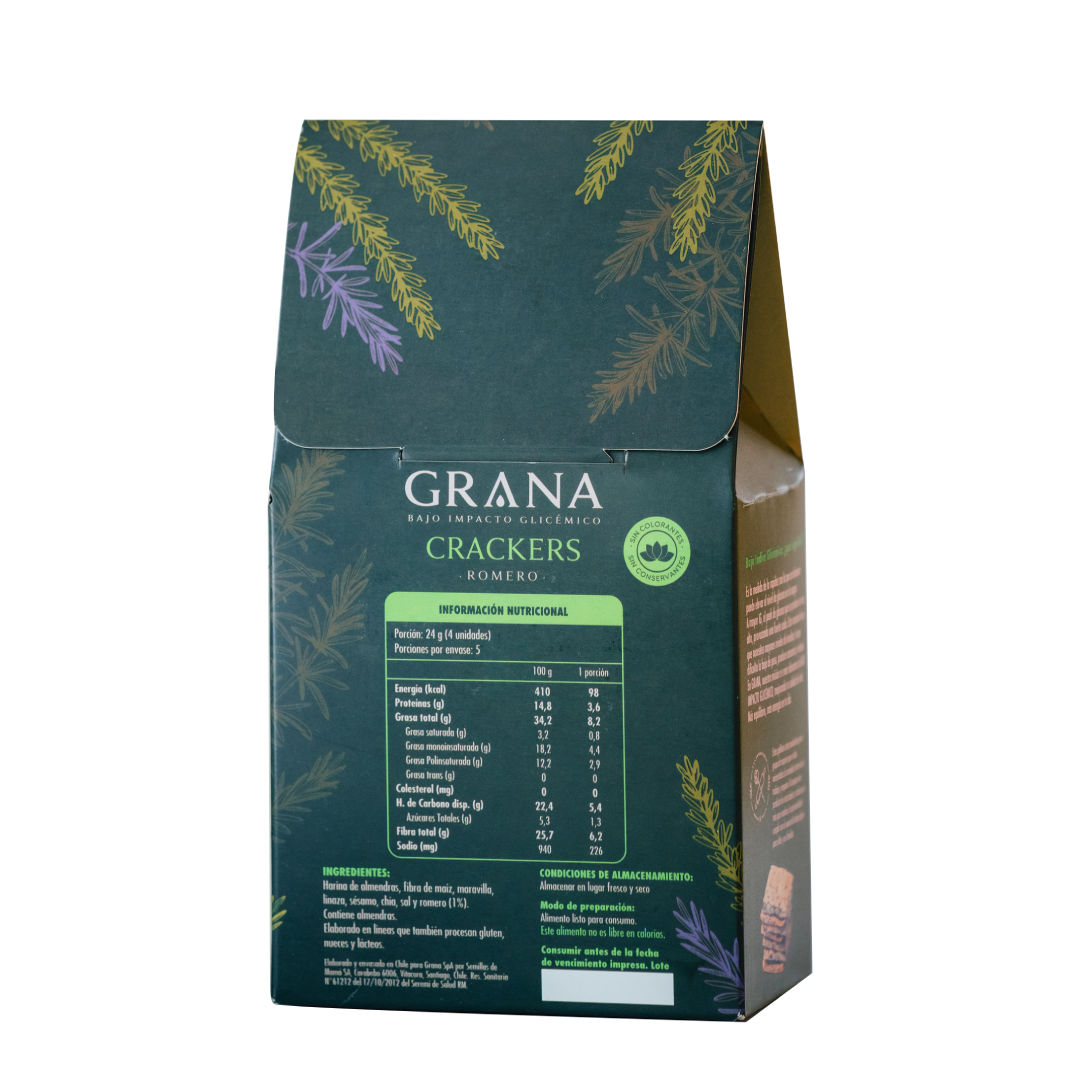 Ingredientes: Harina de almendras, fibra de maíz, semillas de maravilla, semillas de linaza, sésamo, chía, sal de mar, romero y bicarbonato de sodio.