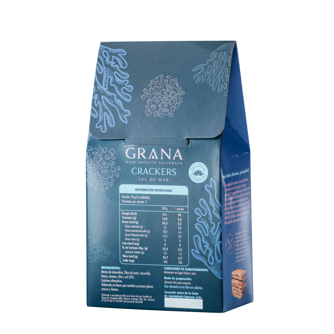 Ingredientes: Harina de almendras, fibra de maíz, semillas de maravilla, semillas de linaza, sésamo, chía, sal de mar y bicarbonato de sodio.